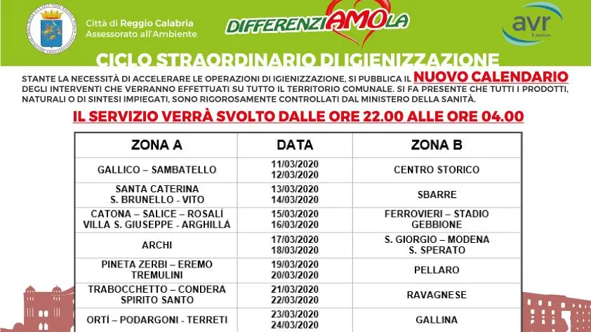 Reggio, il nuovo calendario del ciclo straordinario di igienizzazione. Stante la necessità di accelerare le operazioni di igienizzazione, si pubblica il nuovo calendario degli interventi che verranno effettuati su tutto il territorio comunale. Si fa presente che tutti i prodotti, naturali o di sintesi impiegati, sono rigorosamente controllati dal ministero della sanità. Il servizio verrà svolto dalle ore 22.00 alle ore 04.00.