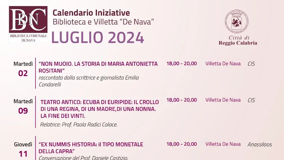 Continuano le attività culturali alla biblioteca e villetta “De Nava” del Comune di Reggio Calabria, grazie al contributo del Cis e dell’Anassilaos. Il 9 luglio, a partire dalle ore 18, la professoressa Paola Radici Colace intratterrà il pubblico su “Teatro Antico: Ecuba di Euripide, il crollo di una regina, di una madre, di una nonna. La fine dei vinti”.