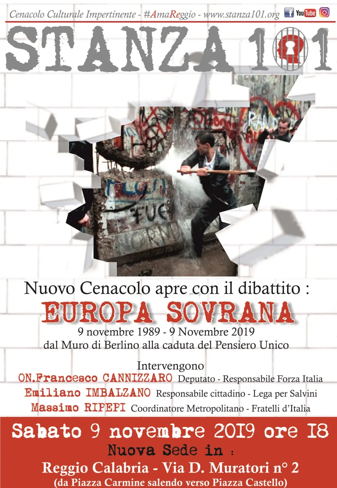 La data scelta non è casuale così come casuale non è il titolo del dibattito “Europa Sovrana: 9 novembre 1989 dalla caduta del Muro di Berlino alla caduta del Pensiero Unico”. Nel 30esimo anniversario di uno degli eventi storici più importanti del secolo scorso, l’occasione vuole offrire spunti di riflessioni nuovi e soprattutto utili per interpretare la società attuale e delineare prospettive per il futuro. Con la ormai consolidata impostazione in cui tutti potranno offrire il proprio contributo, sono stati chiamati ad intervenire Francesco Cannizzaro (deputato e responsabile di Forza Italia), Emiliano Imbalzano (responsabile cittadino per la Lega) e Massimo Ripepi (coordinatore metropolitano di Fratelli d’Italia).