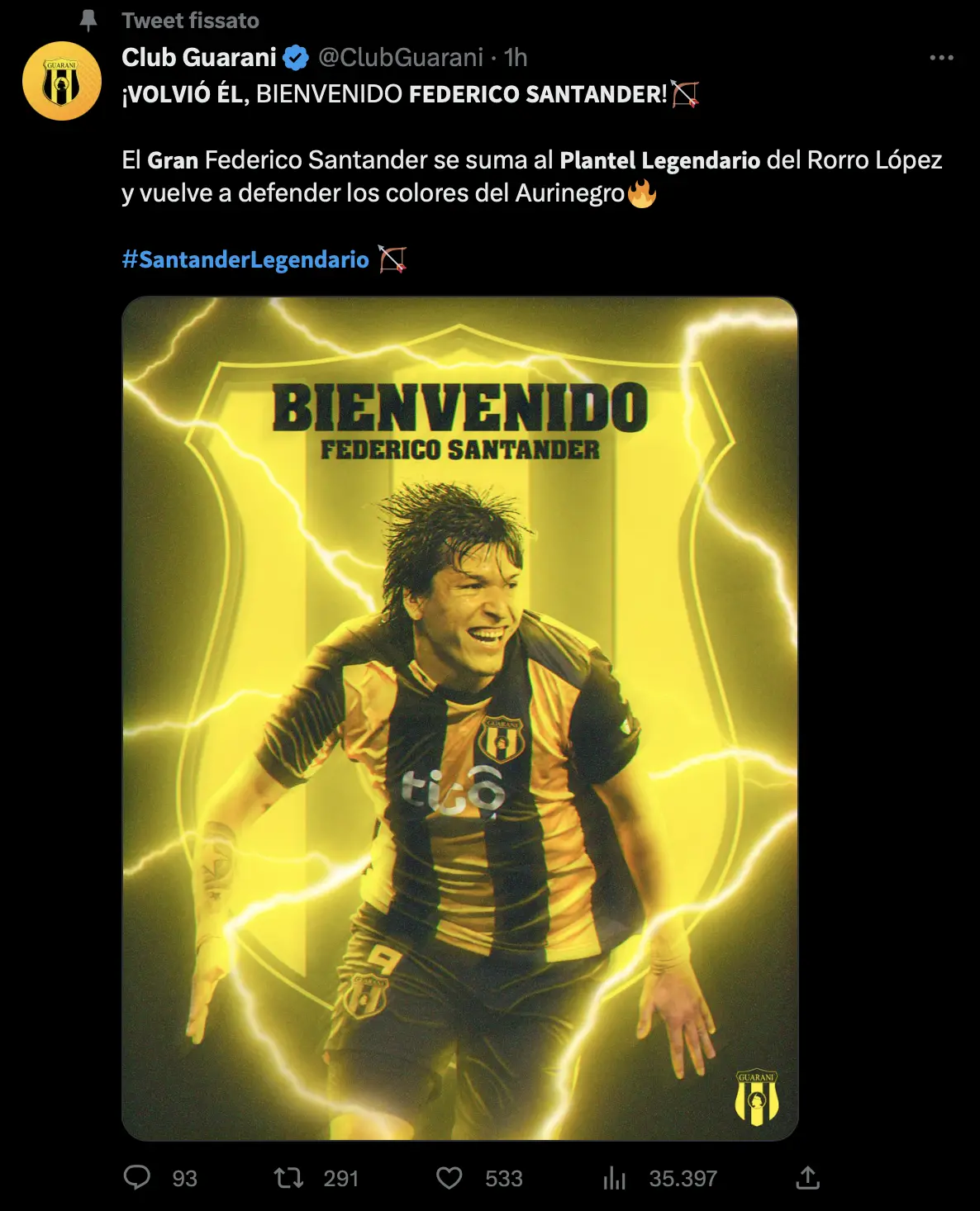 Federico Santander lascia la Reggina. L’attaccante tornerà in patria, firmando col Club Guaranì. Un addio importante – che dovrebbe consumarsi con la formula del prestito – che sgrava le casse amaranto di un ingaggio molto pesante e apre delle prospettive interessanti per il Direttore Taibi di rinforzare la formazione di Inzaghi in questi giorni finali di calciomercato.