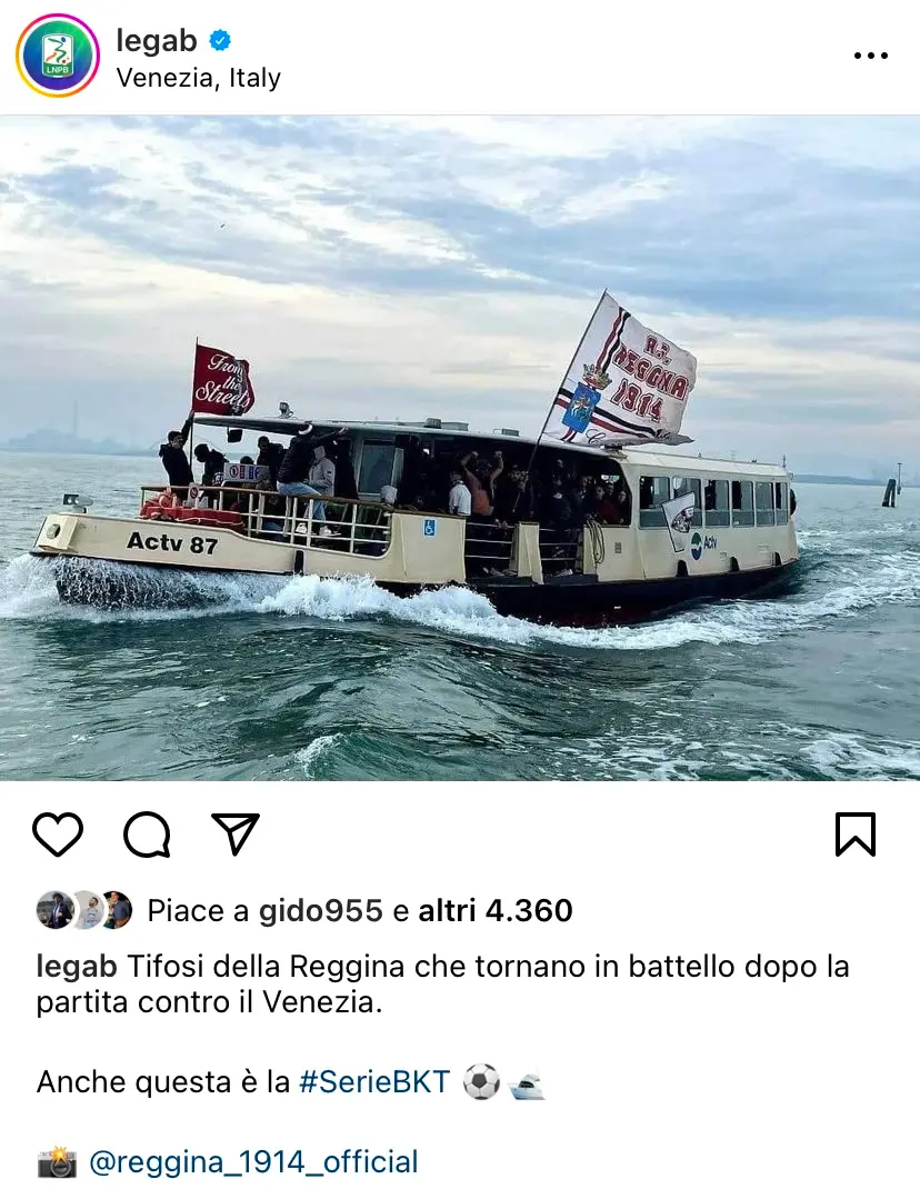 Molto bello lo scatto pubblicato dai profili istituzionali del torneo, che hanno postato la poetica immagine di un battello, necessario per raggiungere lo stadio di Venezia, pieno di tifosi e bandiere della Reggina.