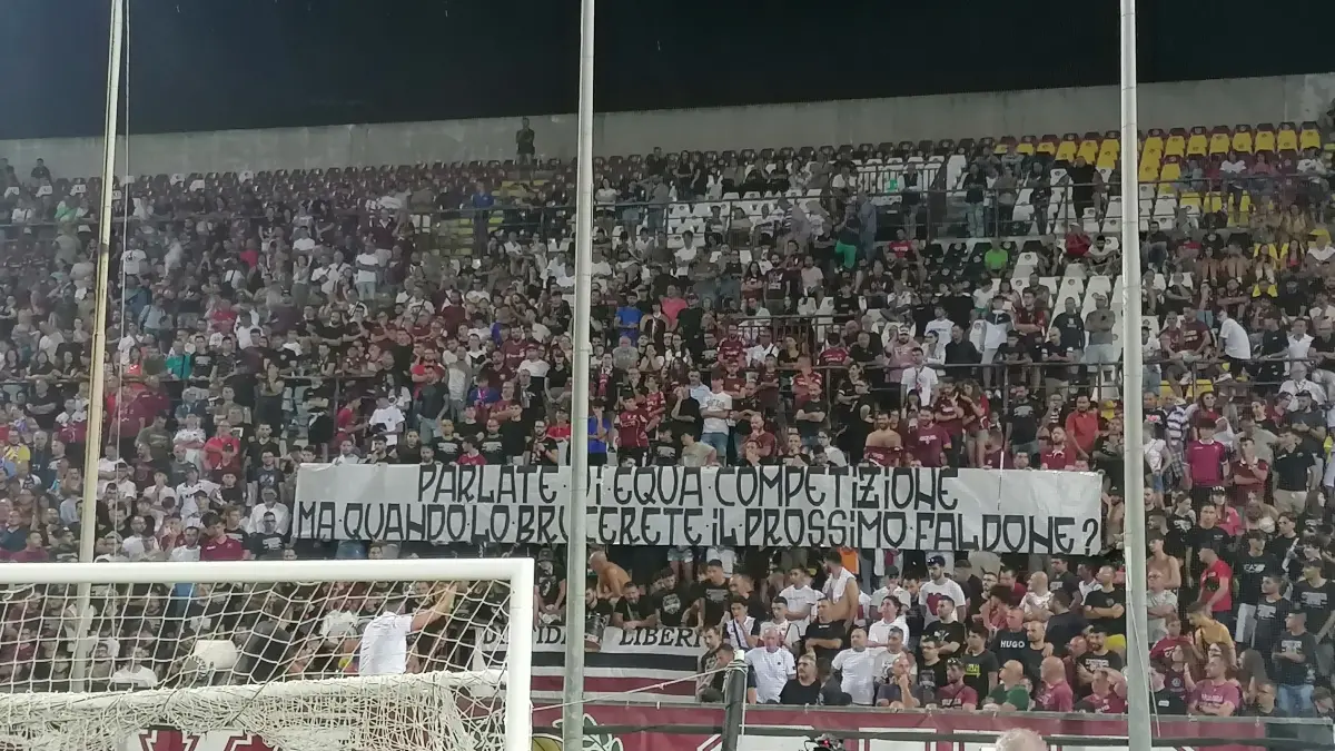 “Parlate di equa competizione, ma quando lo brucerete il prossimo faldone?”. È solo uno degli striscioni esposti questa sera allo stadio “Oreste Granillo” di Reggio Calabria dalla “Curva Sud” che ha fortemente voluto dimostrare ai palazzi del calcio che la città dello Stretto e la sua squadra sono vive e vegete, e sono capaci di smuovere un popolo.