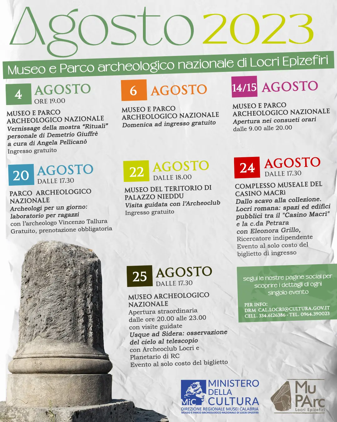 Proseguirà per tutto il mese di agosto il fitto programma di eventi proposto dal Museo e Parco archeologico nazionale di Locri Epizefiri, diretto da Elena Trunfio, con appuntamenti di diversa natura e indirizzati a svariati target di pubblico.