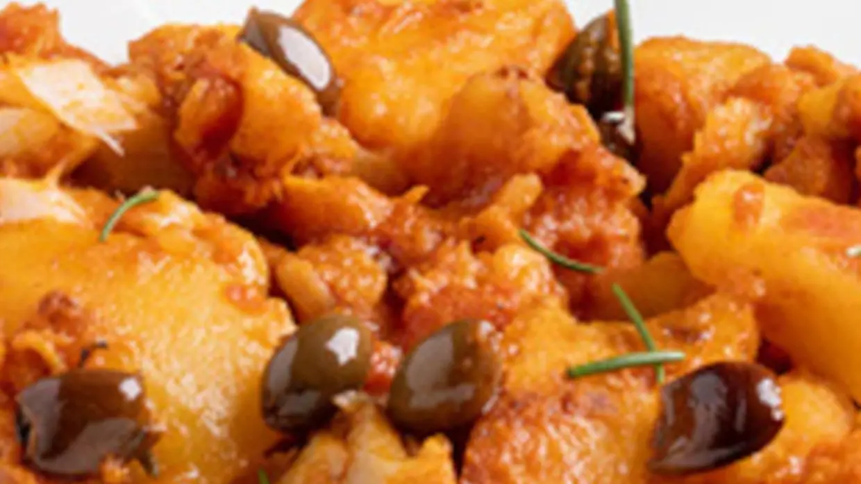 Per preparare il baccalà alla mediterranea, sfilettate il baccalà eliminando la pelle e le lische, dunque tagliatelo a pezzettoni. In una casseruola ampia rosolate le patate a cubetti in un filo d’olio con rosmarino e uno spicchio d’aglio.