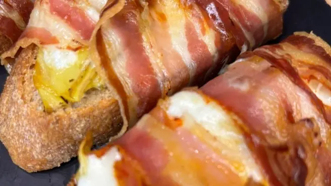 Avvolgete il tutto con la pancetta. Infine cuocete in friggitrice ad aria o in forno per 5/7 min.