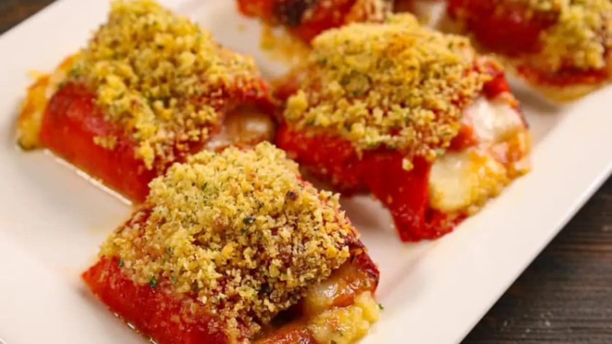 Infine spezzettate le foglie di basilico con le mani e aggiungetele al ripieno. Quando i peperoni si saranno raffreddati, eliminate il peduncolo verde e spellateli. Aprite i peperoni, togliete i semi interni e ricavate falde abbastanza larghe. Adagiate le falde ben aperte su un tagliere cospargetele con il composto di pangrattato precedentemente preparato. Nel centro di ogni falda sistemate poi un paio di piccoli cubetti di mozzarella.