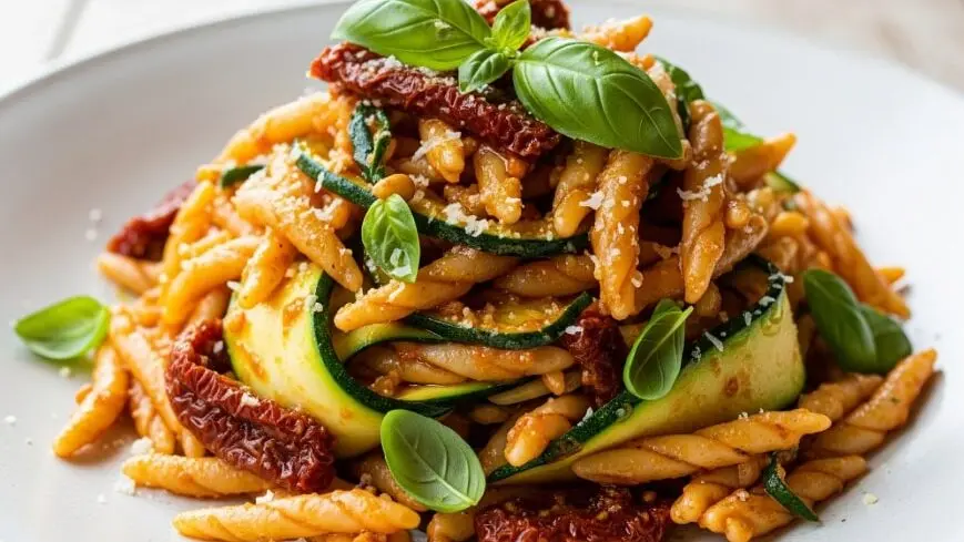 La pasta con pesto di pomodori secchi e zucchine è un primo piatto che porta in tavola i sapori intensi del Mediterraneo con una semplicità disarmante. Questa ricetta, facile e veloce, è la risposta perfetta per chi desidera un pasto gustoso e originale senza dover passare ore ai fornelli. Unisce la sapidità e la dolcezza concentrata dei pomodori secchi a olio con la freschezza e la delicatezza delle zucchine, creando un equilibrio di sapori che conquisterà tutti.