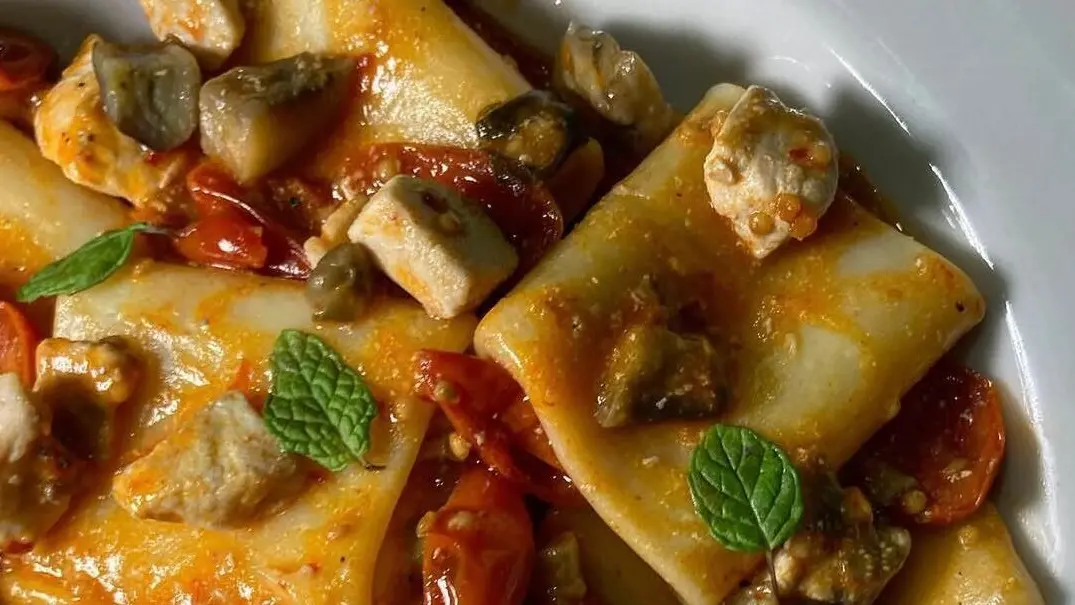 Impiattate i vostri paccheri con pesce spada completando il piatto con le melanzane fritte e qualche figlia di menta .