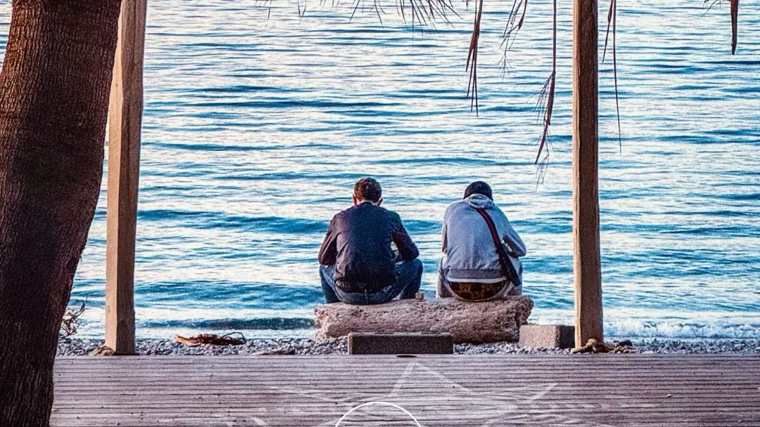 Due amici, un tronco per sedile, il mare davanti. Il tempo si ferma sul lungomare di Reggio Calabria, tra il fruscio delle palme e il silenzio che unisce