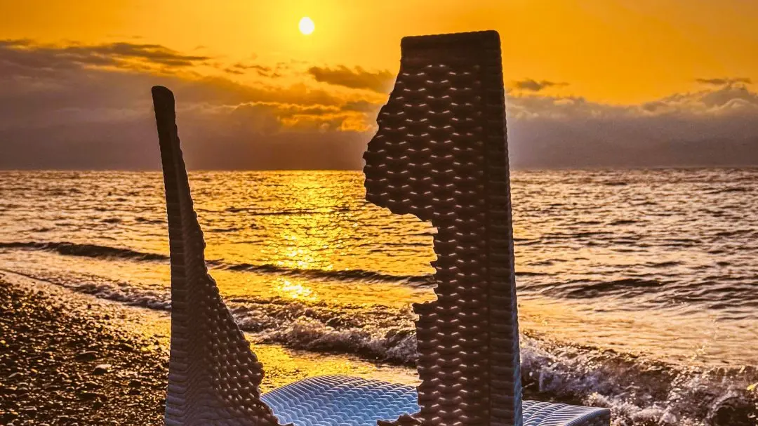 Il mare, intanto, respira lento sotto un tramonto quasi irreale, e tutto diventa più silenzioso. In quel momento la sedia non appare più rotta, ma semplicemente vissuta. Come certe anime che, proprio attraverso le loro fratture, imparano a far passare la luce