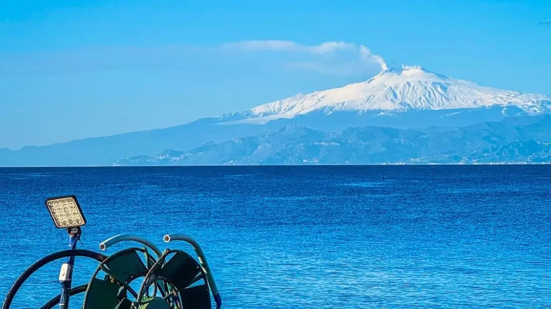 Di fronte a lei, maestoso e lontano, l’Etna alza al cielo il suo respiro fumante. Sembra un gigante che veglia su tutto, immobile ma vivo, misterioso e potente.