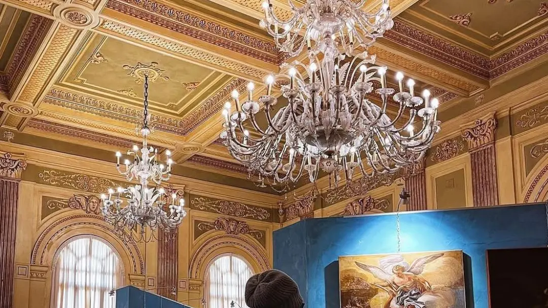 Davanti a un quadro, sotto un lampadario antico, tra le pieghe del tempo che rallenta.