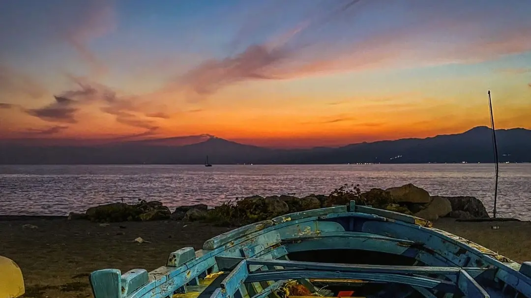 È bella. Di quella bellezza che non ha bisogno di ritocchi. Rovinata il giusto, stanca il giusto. Calda, come una cosa che è stata viva e ora aspetta. Aspetta un’altra mano, un’altra storia. E sotto, il mare che tace, il tramonto che arrossisce, l’Etna che guarda da lontano.