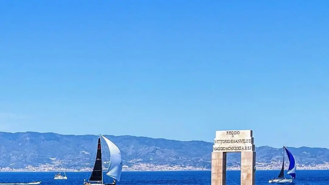 Le vele bianche sembrano note leggere su uno spartito marino, mentre la Sicilia osserva da lontano, vicina e lontana insieme. Un invito a fermarsi, guardare e lasciarsi attraversare dal respiro dello Stretto.