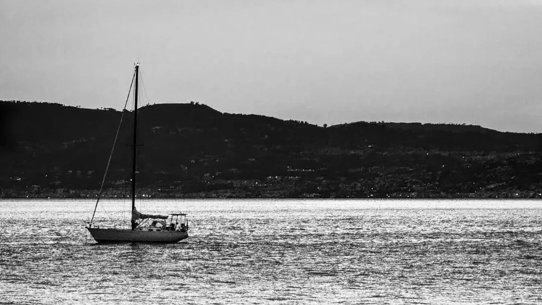 di Lorenzo Vazzana – Nel bianco e nero di un tramonto sullo Stretto, la scena si riempie di significato. Due bambini, seduti sulla riva, si guardano con la tenerezza di chi scopre il mondo a piccoli passi. Le loro sagome si stagliano contro l’acqua che luccica, mentre alle spalle una barca a vela solca placidamente il mare, portando con sé il senso di un tempo lento, sospeso. Non servono parole: i gesti raccontano confidenze, forse sogni, forse promesse fatte con occhi sinceri. E un amore bambino, fatto di semplicità e presenza, colto nell’attimo giusto. La luce che sfuma sull’acqua, il silenzio visivo della composizione, la calma profonda del mare: tutto parla di un legame nascente, di un ricordo che si fisserà nel cuore molto prima che nella memoria.