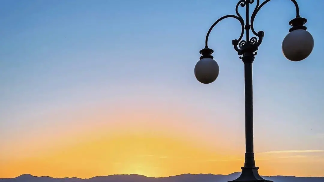 Il lampione in primo piano, spento, sembra attendere con eleganza il calare definitivo del giorno. La ringhiera, intrisa di salsedine e storia, osserva silenziosa la scena, come testimone discreta di infiniti tramonti.