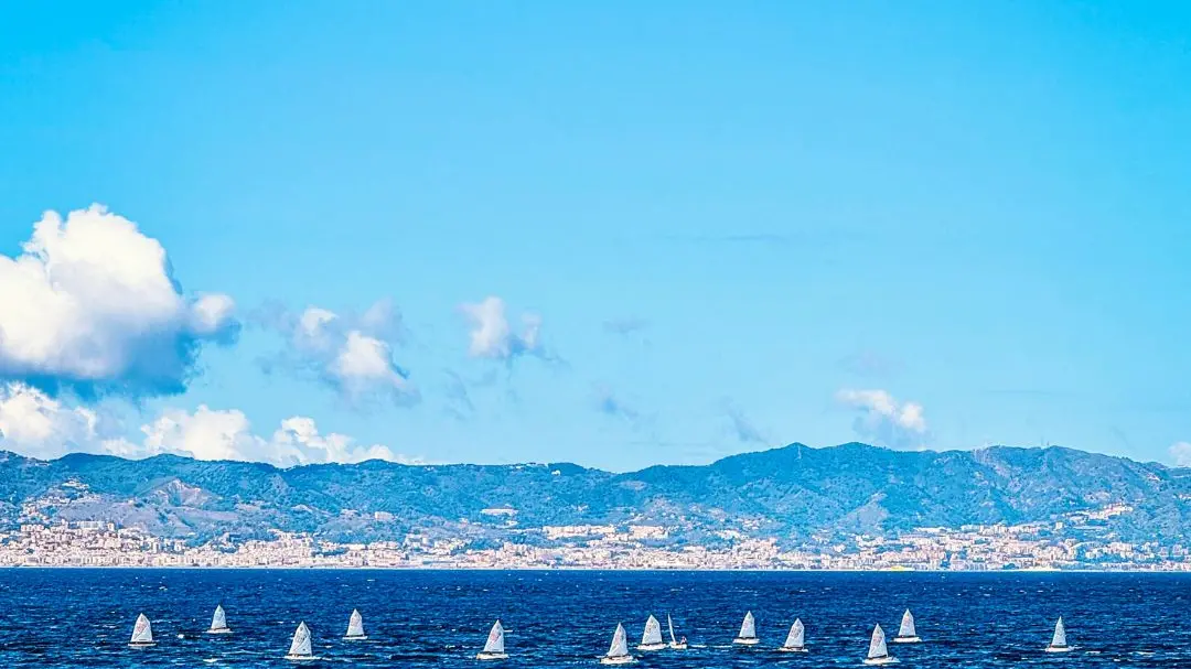 Dietro di lei, si apre uno degli scenari più romantici del Mediterraneo: lo Stretto di Messina, calmo e profondo, accarezzato dal volo delle vele.