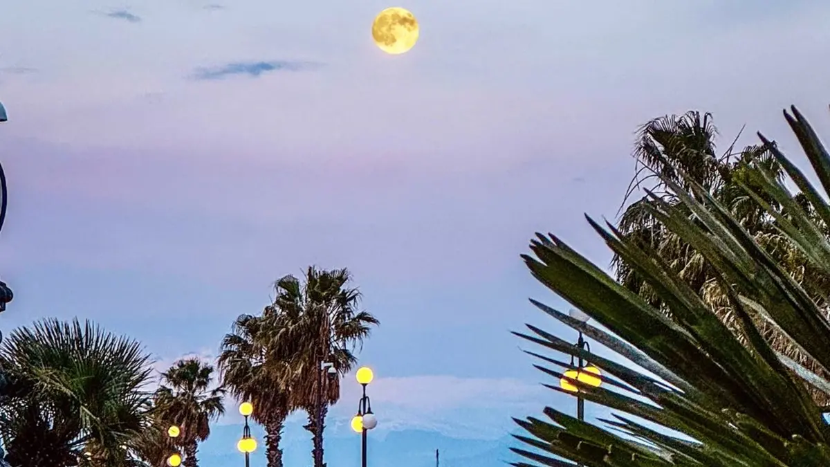 Uno scorcio di lungomare si veste di luce rosata mentre la luna, ancora sospesa, illumina il silenzio del mattino. Un incontro fragile tra notte e giorno che diventa pura poesia.