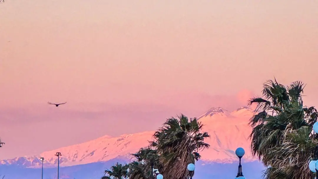 Un istante sospeso sul lungomare, dove il rosa del cielo accarezza il respiro dell’Etna e un gabbiano veglia silenzioso sull’inizio di un nuovo giorno