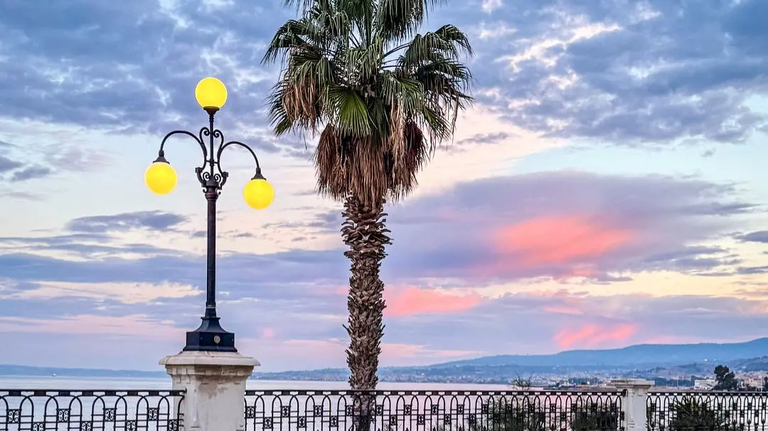 Sul lungomare di Reggio Calabria, tra la luce di un lampione ancora acceso e un cielo che si accende di rosa, nasce un nuovo giorno carico di poesia