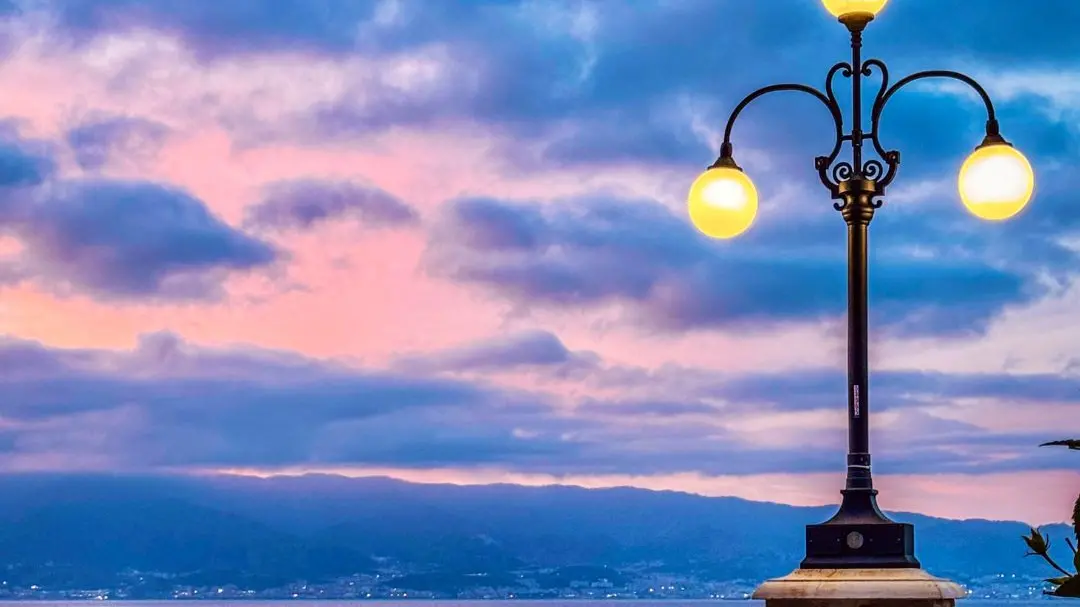Un lampione acceso, un cielo rosa e blu che sfuma tra le nuvole, e lo Stretto che sussurra storie antiche. A Reggio Calabria, ogni angolo sa di poesia