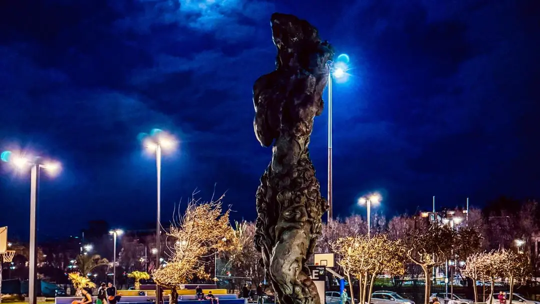 Sul fondo, il playground racconta un’altra storia: echi di risate, promesse sussurrate, corse che sanno di libertà. È un contrasto dolce, quello tra la quiete solenne del monumento e la vitalità lontana dei giochi. Eppure tutto si tiene, come in un abbraccio invisibile che unisce passato e presente. In quell’istante sospeso, la città diventa poesia: la scultura osserva, la luna benedice, e ogni cosa trova il proprio posto nel cuore della notte.
