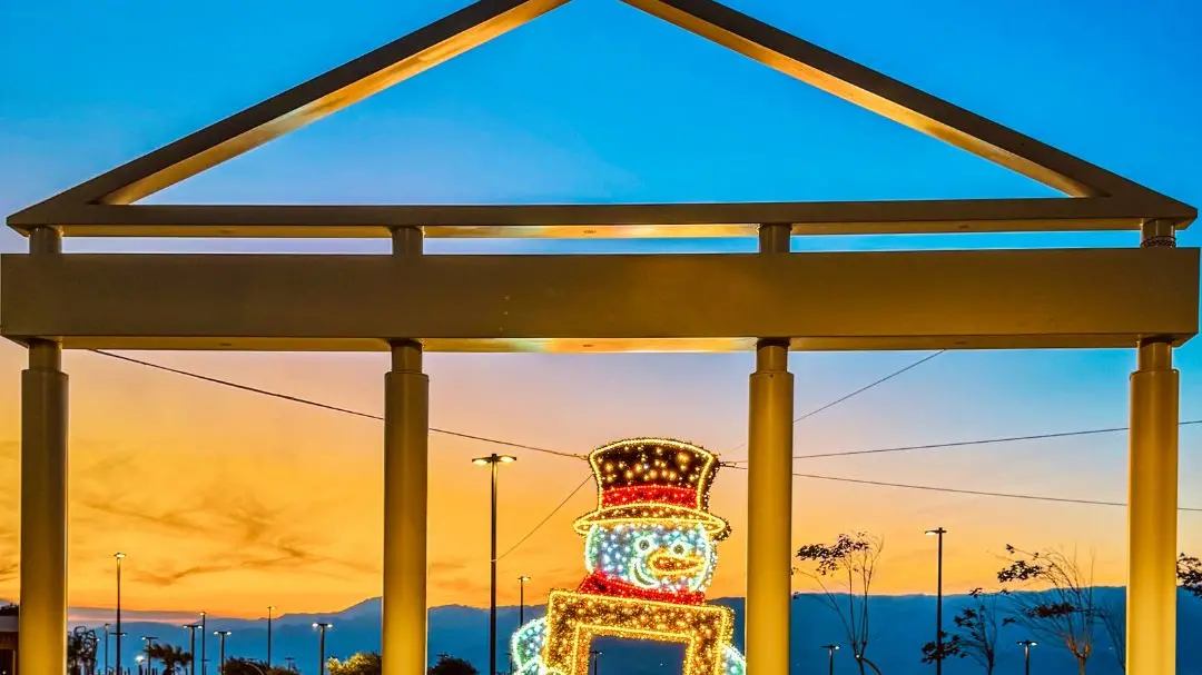 Nel cuore della zona ludica di Reggio Calabria, il tempietto si veste di festa. Un pupazzo di neve illuminato accoglie il Natale, mentre il sole, lento, si spegne alle sue spalle in un cielo dai toni dorati.
