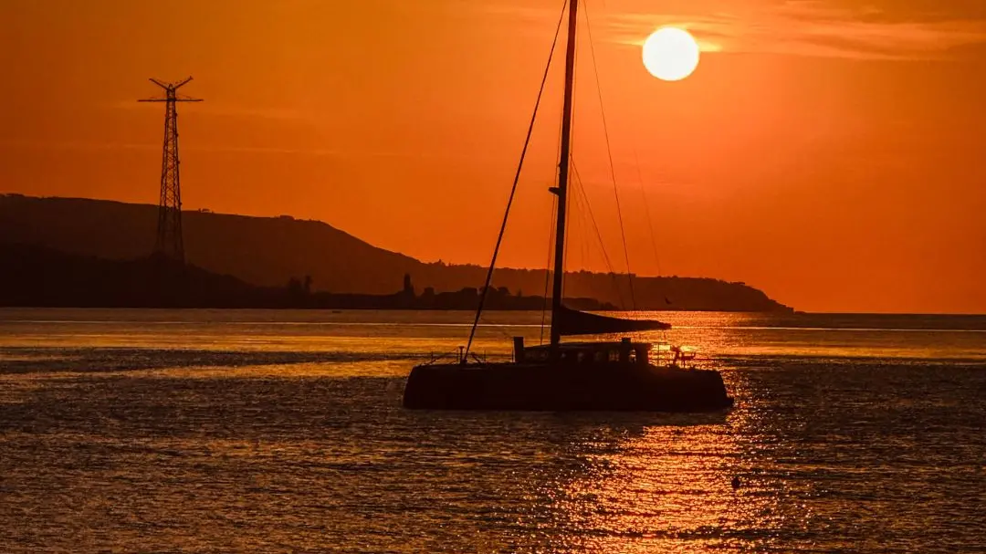 In uno degli angoli più suggestivi della Calabria, la spiaggia di Scilla si trasforma al tramonto in un teatro di luce e poesia. La scena è incorniciata da un cielo infuocato che sfuma dal rosso al rame, mentre il sole si adagia lentamente sull’orizzonte, proprio alle spalle di una barca a vela che pare immobile, come sospesa tra cielo e mare. In primo piano, una coppia assiste in silenzio, quasi in preghiera, a questo momento che sa di eterno. Sullo sfondo, Punta Faro veglia la scena, sottile e solitaria. È uno di quei tramonti che non chiedono parole, ma si imprimono dentro con la forza semplice della bellezza vera. Un attimo sospeso, in cui il tempo sembra fermarsi e la luce diventare memoria.