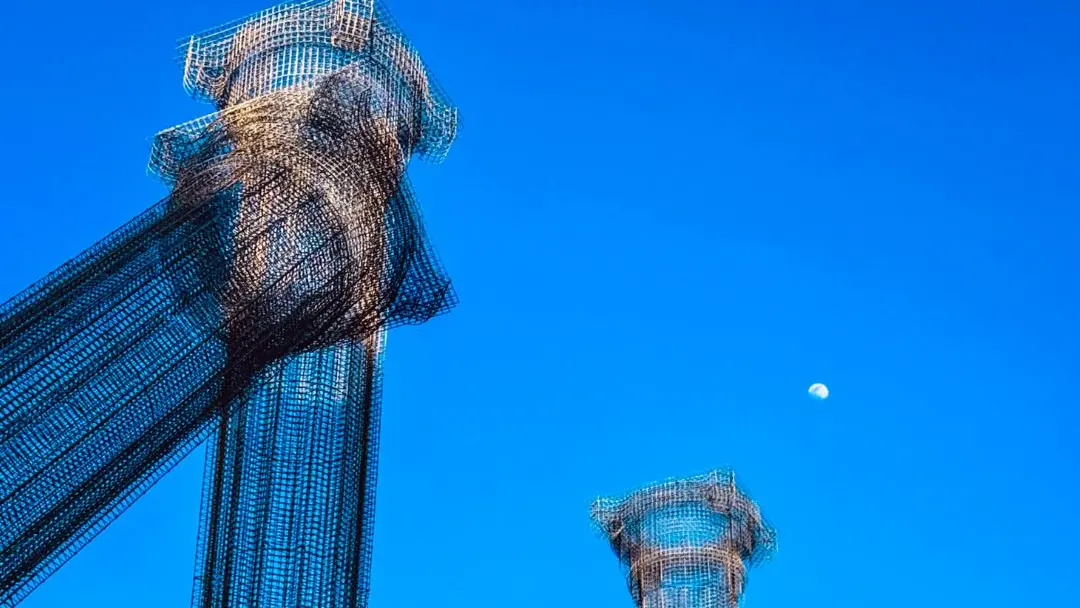 C’è un istante, sospeso tra notte e giorno, in cui anche l’opera sembra respirare. In questa mattina azzurra e limpida, la luna indugia ancora alta, custode discreta di un’intimità inattesa. Due colonne si cercano, si avvicinano, si poggiano l’una all’altra come farebbero due corpi stanchi dopo un lungo cammino. Non è cedimento, il loro: è fiducia.