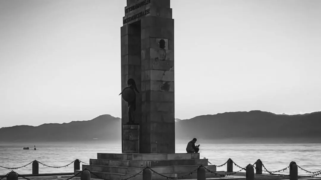 Un uomo siede in silenzio sul lungomare, accarezzato dalla luce del tramonto. Tra memoria e sogno, il tempo sembra fermarsi sotto la protezione eterna della dea