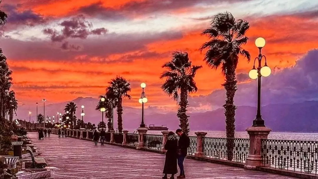 di Lorenzo Vazzana – Il lungomare si distende tranquillo sotto un cielo che sembra dipinto con pennellate di fuoco. Il tramonto scivola lentamente verso l’orizzonte, tingendo l’acqua di rosso profondo e sfumature violacee che si riflettono come seta mossa dal vento. In questo momento sospeso tra giorno e notte, una coppia si ferma vicino alla balaustra. Non servono grandi gesti: basta un sussurro, appena accennato, per riempire l’aria di complicità.