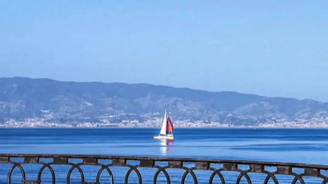 La ringhiera del lungomare di Reggio Calabria accoglie lo sguardo, come un abbraccio familiare. Davanti, lo Stretto calmo si lascia attraversare da una barca a vela che fende il silenzio, disegnando poesia sull’acqua
