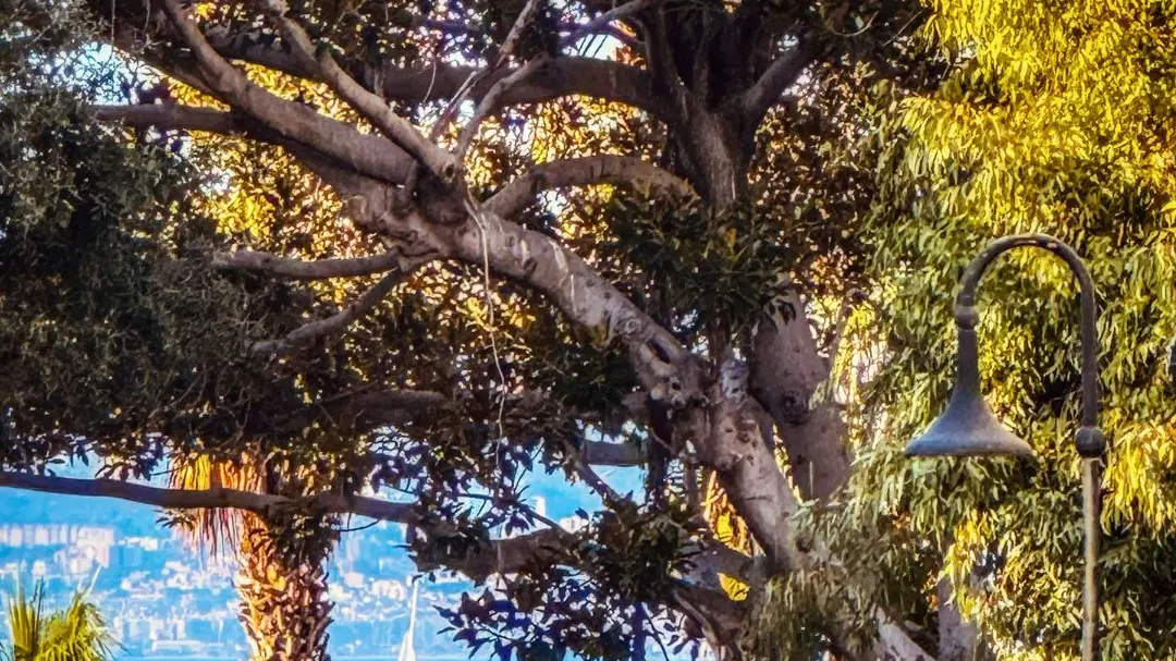 Uno scorcio rubato tra gli alberi secolari del lungomare di Reggio Calabria rivela l’incanto: la storica ringhiera e una barca a vela che solca lenta le acque dello Stretto, dipingendo poesia nel silenzio del tempo