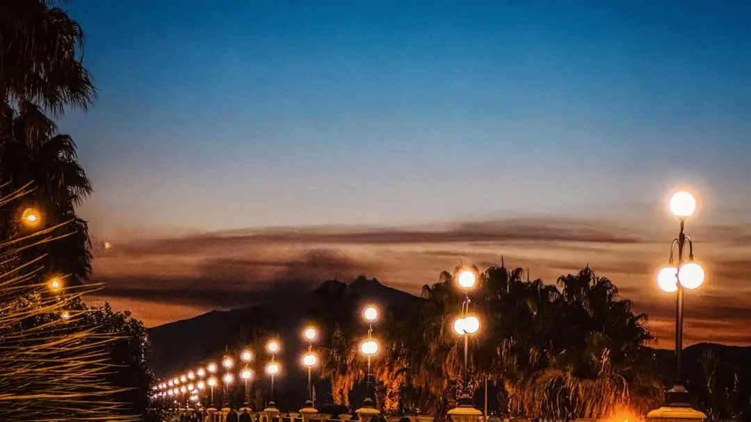 La Via Marina si tinge d’arancio, come se il sole, prima di andare via, volesse sfiorare ogni cosa con un ultimo bacio di luce. Le palme si allungano in silhouette silenziose, mentre il mare resta immobile, cullando riflessi dorati. In fondo, lei: l’Etna.