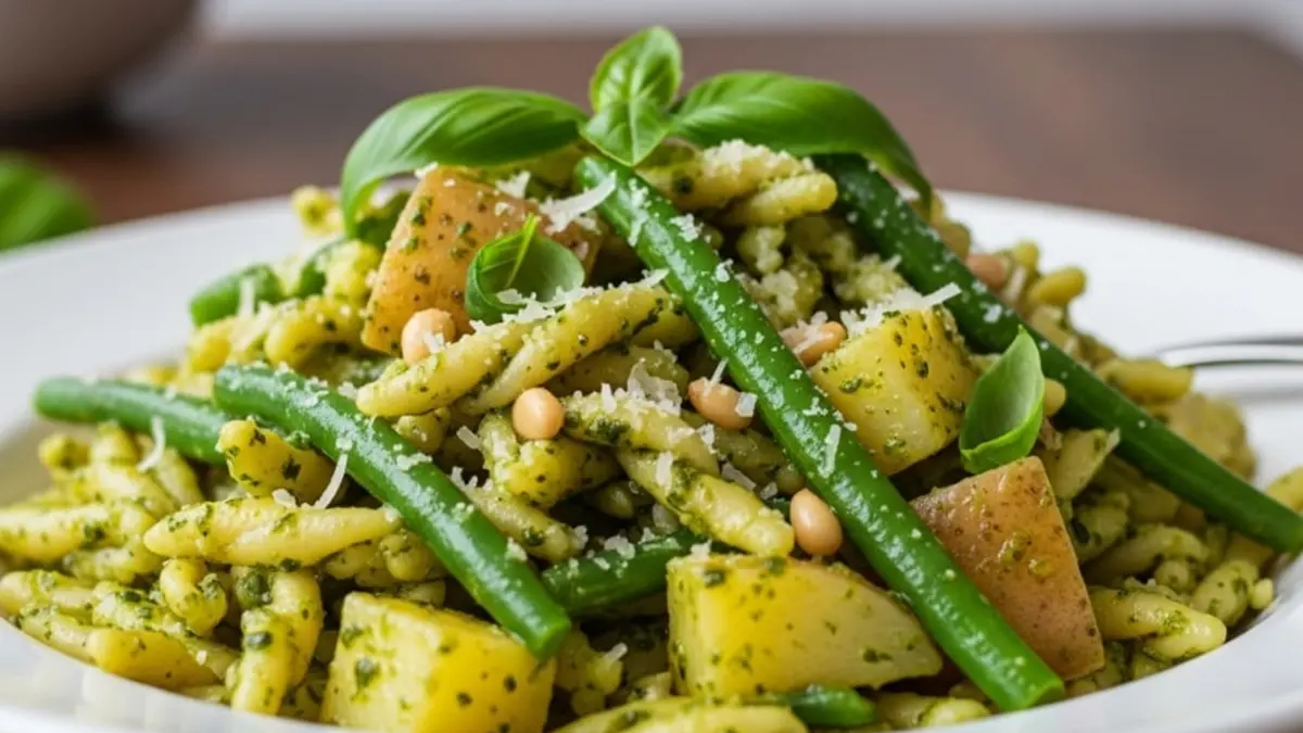 La pasta al pesto, patate e fagiolini è un primo piatto vegetariano che celebra la semplicità e la genuinità. Nasce dall’unione di due ricette classiche: la pasta al pesto e le verdure lesse. Il risultato è un piatto che unisce sapori e consistenze in un connubio perfetto e sorprendente.