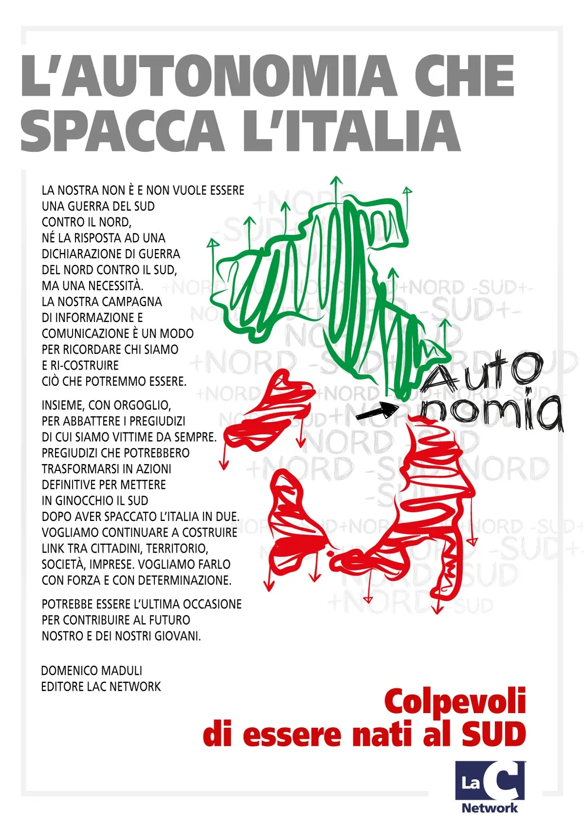La nostra non è e non vuole essere una guerra del Sud contro il Nord, né la risposta ad una dichiarazione di guerra del Nord contro il Sud, ma una necessità. La nostra campagna di informazione e comunicazione è un modo per ricordare chi siamo e ri-costruire ciò che potremmo essere. Insieme, con orgoglio per abbattere i pregiudizi di cui siamo vittime da sempre. Pregiudizi che potrebbero trasformarsi in azioni definitive per mettere in ginocchio il Sud dopo aver spaccato l’Italia in due.