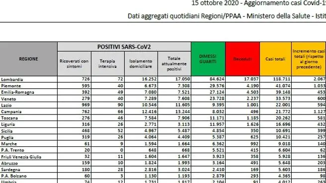 Le Regioni più colpite oggi, che superano i mille nuovi casi, sono: Lombardia (+2.067) che detiene il record di più casi per il terzo giorno di fila, Campania (+1.127) e Piemonte (+1.033). Mentre le Regioni che hanno più persone in ospedale sono: Lazio (969; ieri erano 937), Campania (762; ieri erano 735) e Lombardia (726; ieri erano 645). Il maggior numero di malati in terapia intensiva si trova sempre nelle stesse tre Regioni: Lazio (90; ieri 85), Lombardia ( 72; ieri 64) e Campania (66; ieri 61).
