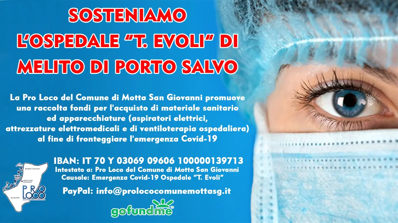 Causale: Emergenza Covid-19 Ospedale “T. Evoli” - attraverso Paypal: info@prolococomunemottasg.it