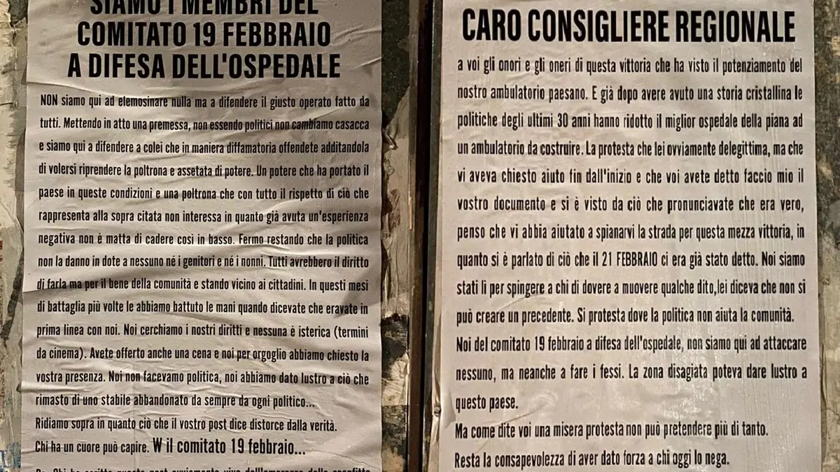 Nel secondo, in risposta al consigliere regionale Giannetta, si legge invece: «Caro consigliere regionale, a voi gli onori e gli oneri di questa vittoria che ha visto il potenziamento del nostro ambulatorio paesano. E già dopo avere avuto una storia cristallina le politiche degli ultimi 30 anni hanno ridotto il miglior ospedale della Piana in un ambulatorio da costruire. La protesta che lei ovviamente delegittima, ma che vi aveva chiesto aiuto fin dall’inizio, e che voi avete detto “faccio mio il vostro documento”, e si è visto da ciò che pronunciavate che era vero, pensiamo che vi abbia aiutato a spianarvi la strada per questa mezza vittoria, in quanto si è parlato di ciò che il 21 febbraio ci era già stato detto.
