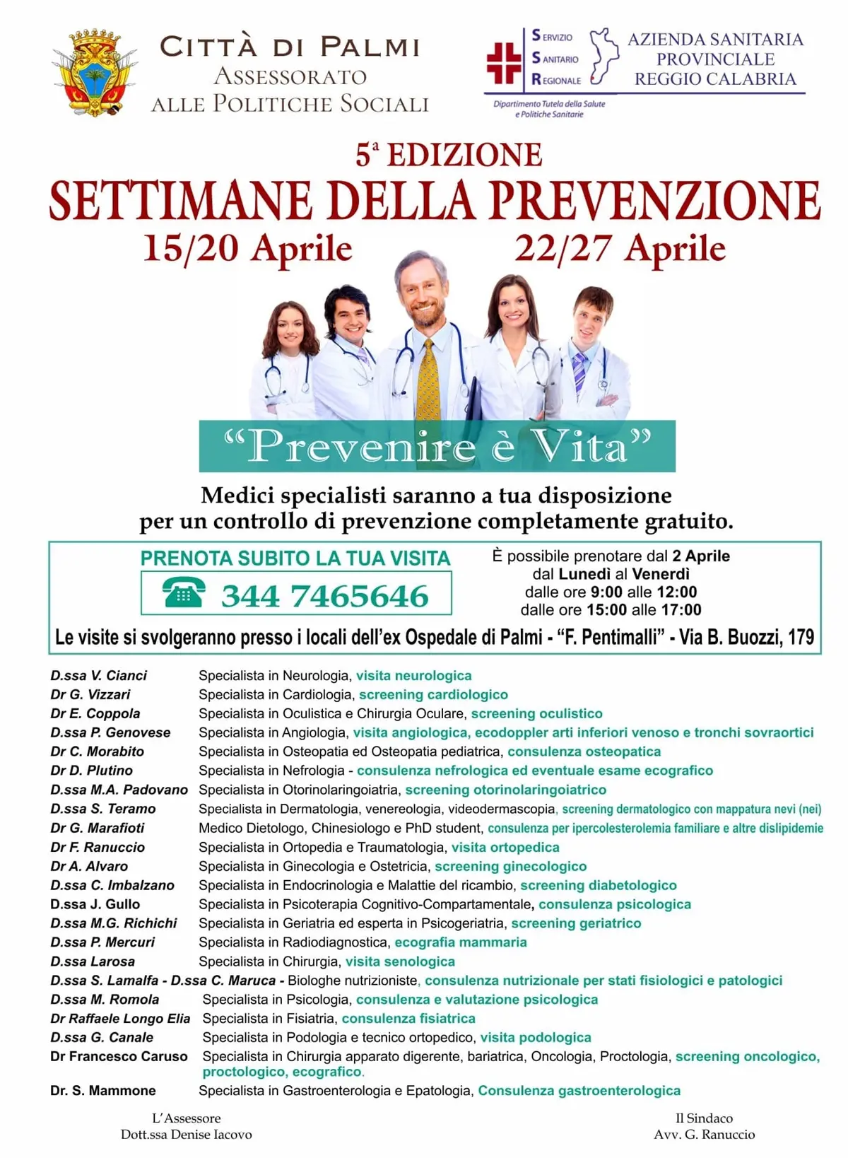 Dal 15 al 20 aprile e dal 22 al 27 aprile, in collaborazione con l’Asp, si terrà nell’ex ospedale di Palmi, la 5° edizione delle Settimane della prevenzione. Più di venti medici hanno dato la loro disponibilità per accogliere coloro i quali intendono sottoporsi a un controllo specialistico, con screening, visite e consulenze. «E’ una iniziativa di straordinario valore sociale – ha commentato il sindaco Giuseppe Ranuccio – che siamo orgogliosi di offrire del tutto gratuitamente alla città. La nostra sanità vive ormai da anni un’epoca difficile, spesso legata a fattori economici piuttosto che sociali: c’è però un mondo, quello dei medici, degli infermieri, degli operatori del settore, che coltiva ogni giorno l’etica del sostegno e dell’aiuto. A loro va la mia personale riconoscenza».