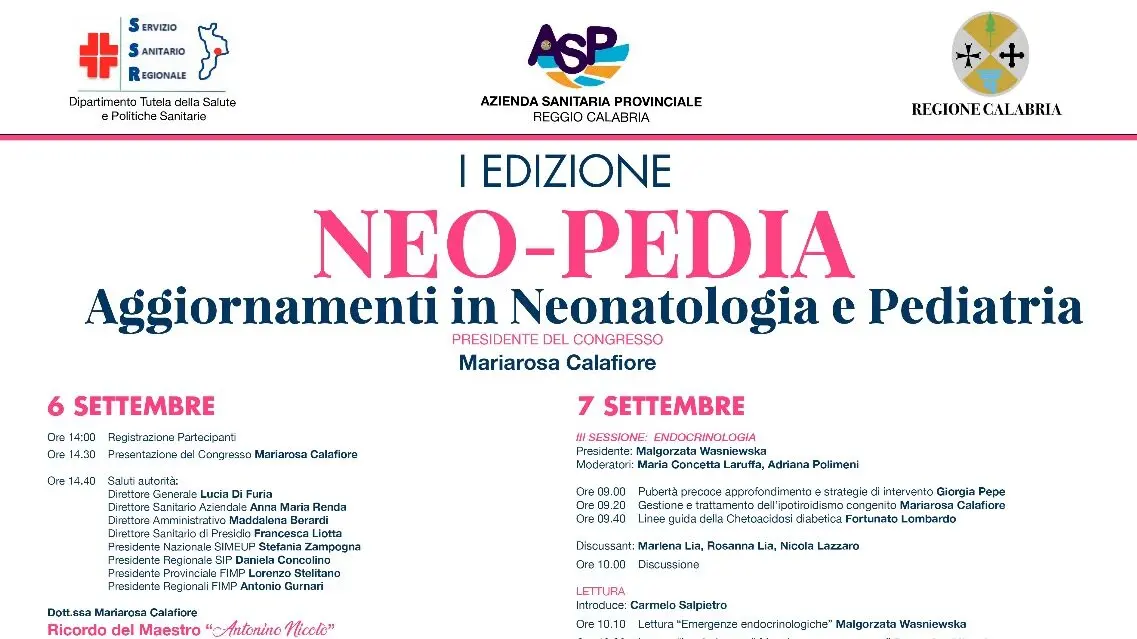Prima edizione di “Neo-Pedia”, convegno sugli aggiornamenti della neonatologia e pediatria che sarà ospitato, venerdì 6 e sabato 7 settembre 2024, all’ hotel Altafiumara di Santa Trada a Reggio Calabria.