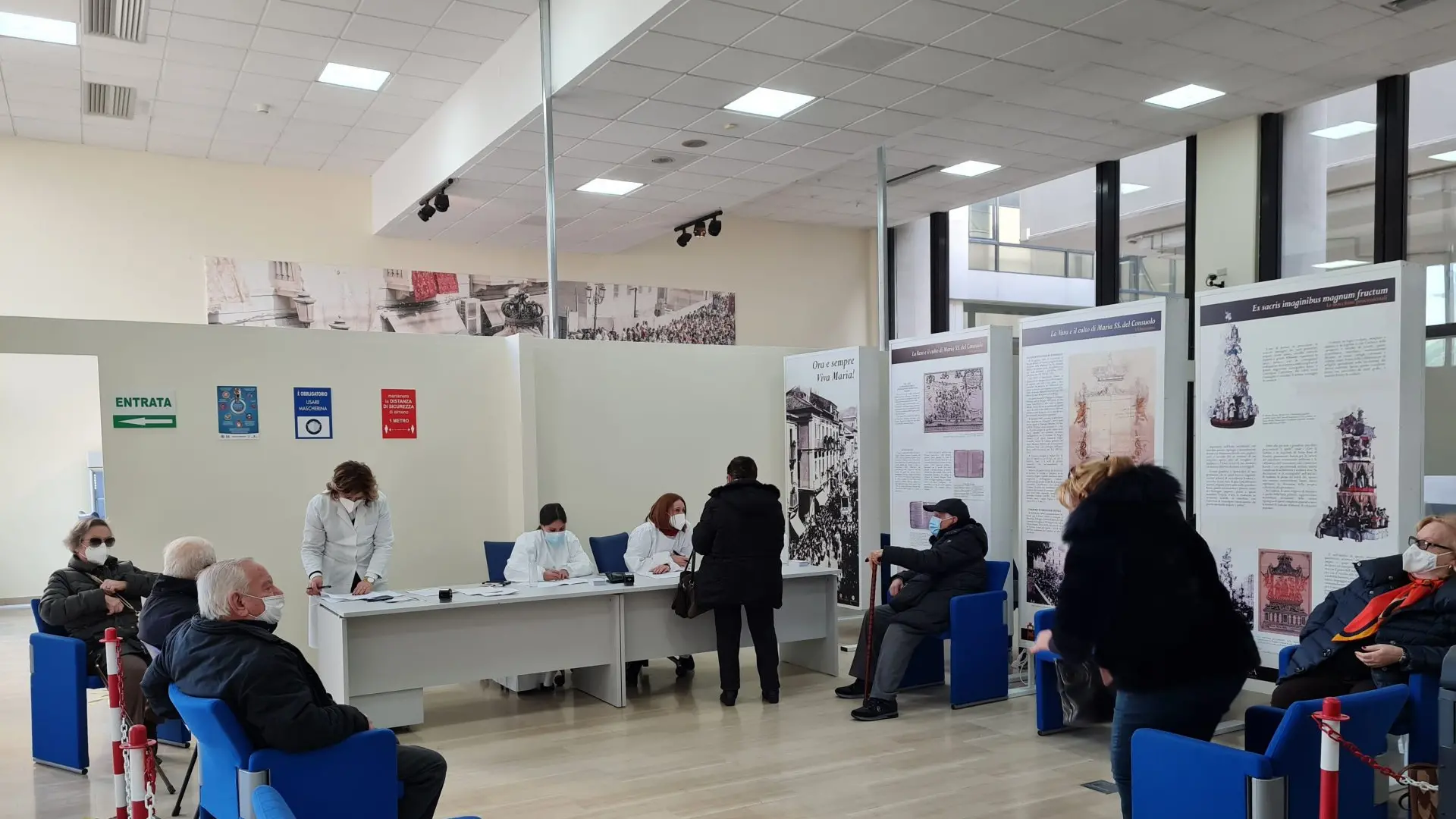 L’attuale configurazione della sala Monteleone è stata giudicata idonea rispetto agli standard di mantenimento delle distanze, e capace di ospitare fino a cinque postazioni vaccinali.