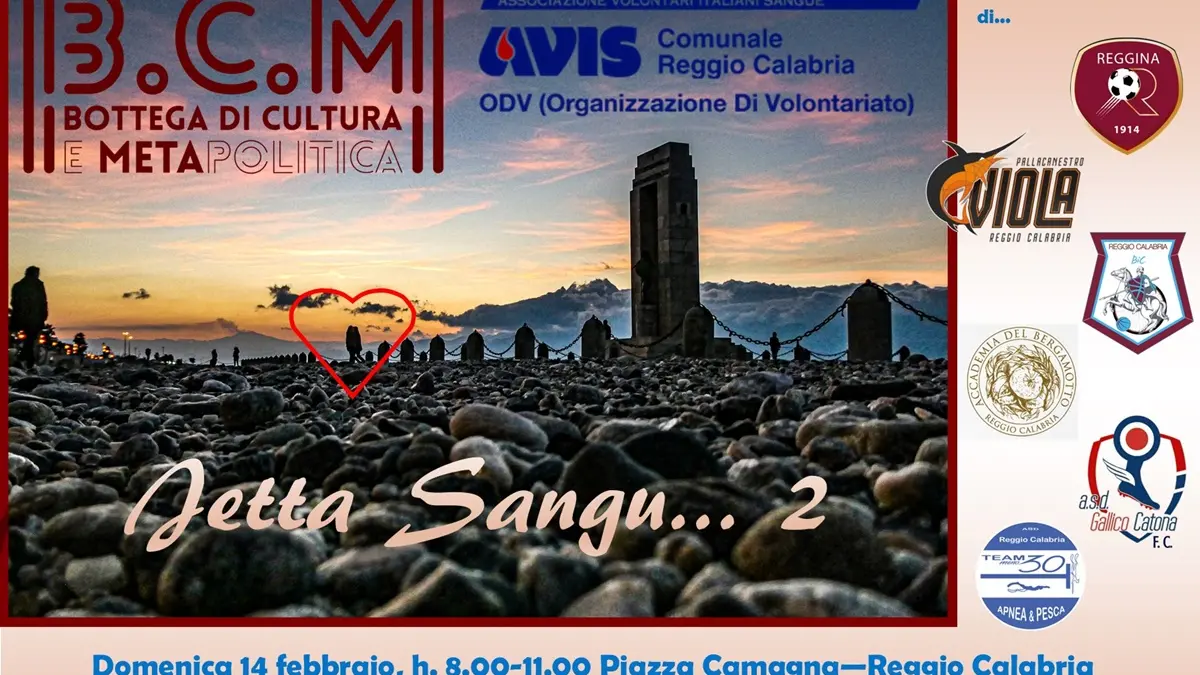Donare il sangue nel giorno di San Valentino è un autentico gesto d’amore. Per questo, domani, dalle 8 alle 11 a piazza Camagna si potrà effettuare la donazione organizzata da Bottega di Cultura e Meta… Politica e AVIS Comunale Reggio Calabria, che invitano la cittadinanza a partecipare numerosa. Aderiscono all’iniziativa, facendo seguito alla già attiva partecipazione dell’evento di agosto, le maggiori realtà sportive della città. Reggina, Viola Basket, Reggio Calabria BiC, Asd Gallico Catona e ASD Team – 30.