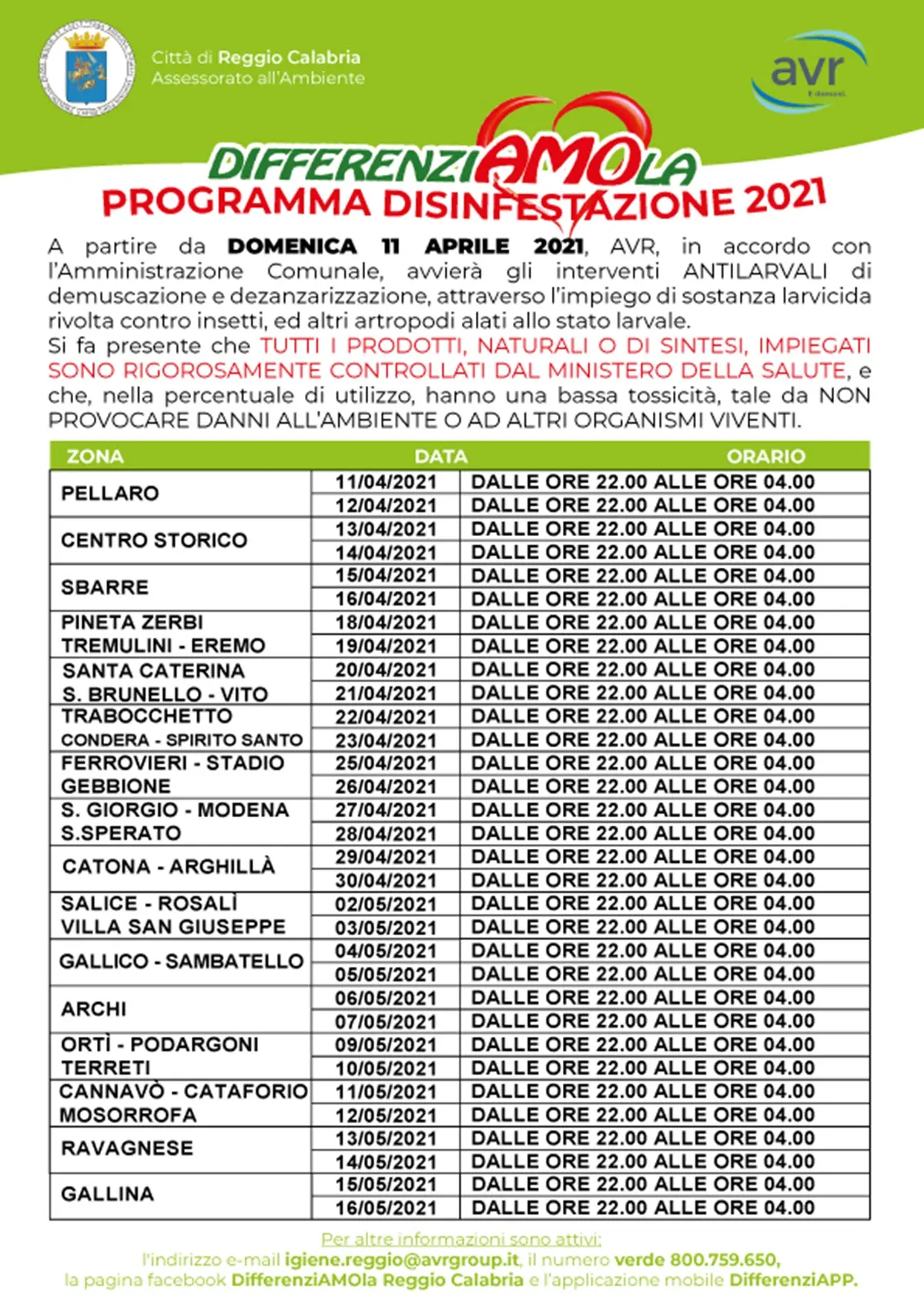 Gli interventi, larvicida ed adulticida, vengono svolti in orario notturno per i minori disagi possibili all’utenza, e sono sempre preceduti da opportuna informazione alla cittadinanza per mezzo di cartelli informativi lungo le strade interessate. L’Avr ha fatto presente che i prodotti utilizzati sono rigorosamente controllati dal Ministero della Salute, e che, nella percentuale di utilizzo, hanno una bassa tossicità, tale da non danneggiare l’ambiente o altri organismi viventi. Per qualsiasi informazione sono attivi l’indirizzo email igiene.reggio@avrgroup.it, il numero verde gratuito 800. 759. 650, la pagina Facebook DifferenziAMOla Reggio Calabria e l’Applicazione mobile “DifferenziApp”.