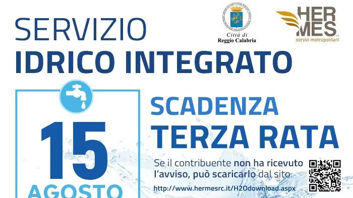 Hermes Servizi Metrolitani, comunica ai contribuenti reggini che giorno 15 agosto scade la Terza Rata del Servizio Idrico Integrato. Per chi non avesse ricevuto l’avviso o l’ha smarrito può scaricarlo dal sito hermes al seguente link: http://www.hermesrc.it/Hermes_H2Odownload.aspx.