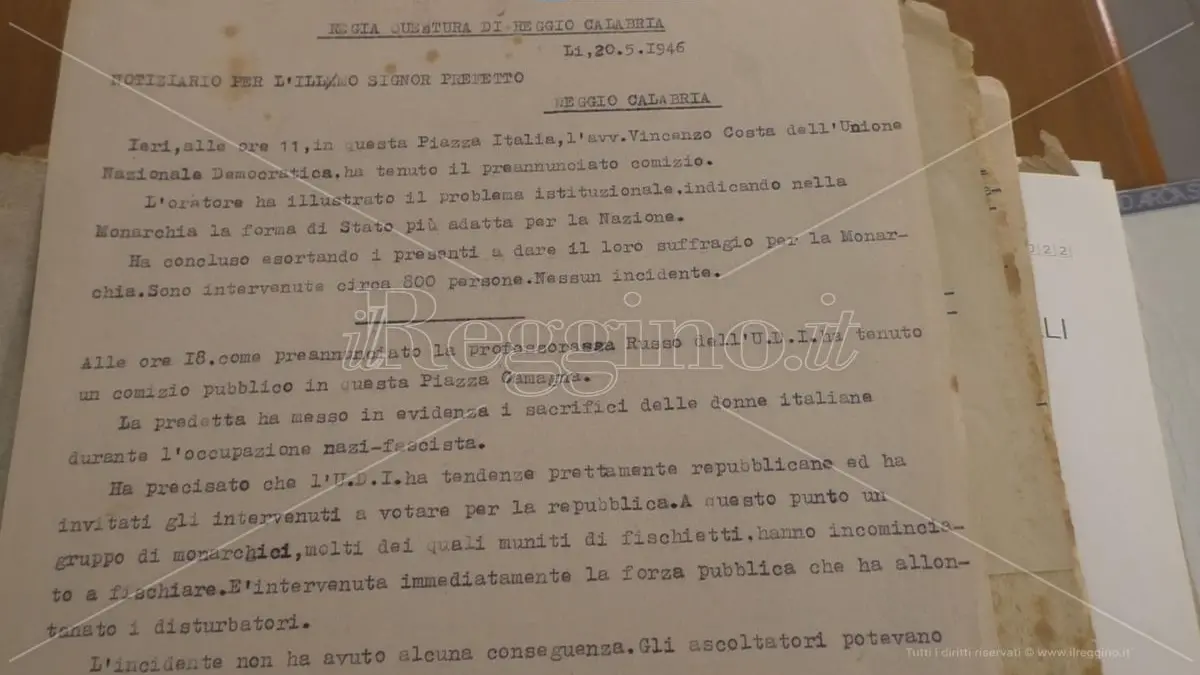 I documenti, custoditi all’Archivio di Stato, dunque, testimoniano una certa vitalità in vista del Referendum che di lì a breve avrebbe avuto luogo con un responso reggino in controtendenza rispetto al dato nazionale. A Reggio, infatti, vinse la Monarchia con una percentuale di poco più del 60%. Con un’affluenza che per un soffio non ha toccato il 90%, in Italia scelsero la Donna Turrita oltre 12 milioni (12 717 923) di italiane e italiani. Una percentuale che di poco superò il 50% dei voti validi. Per la Monarchia a sbarrare sulla scheda elettorale lo Stemma sabaudo furono poco più di 10 milioni (10 719 284) di italiane e italiani.