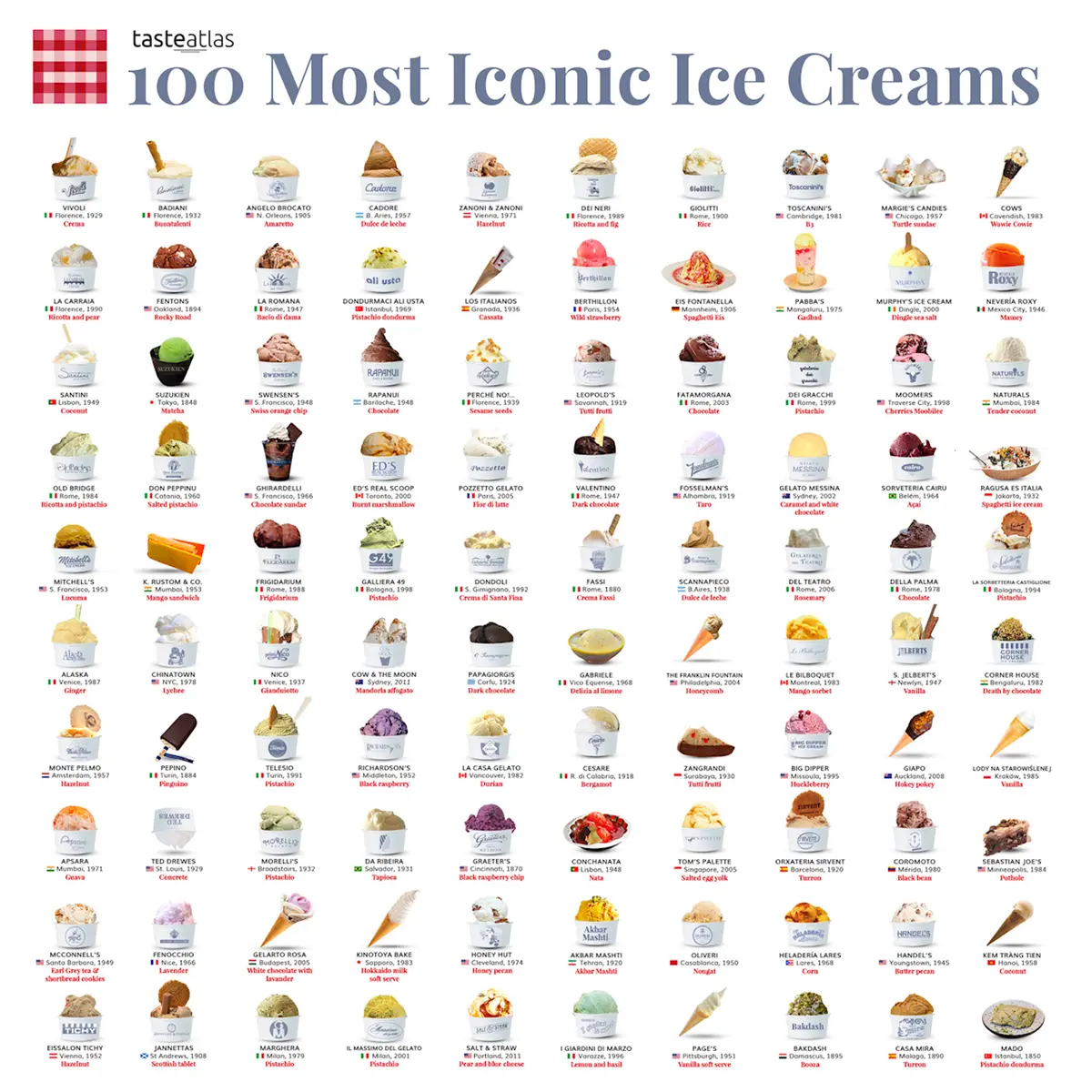 Ogni esercizio e gusto premiati, infatti, pur condividendo un comune amore per il freddo, presenta caratteristiche uniche, modellate da ingredienti regionali, tecniche e influenze culturali, perché i gelati, parola di TasleAtlas «nelle loro mille forme, sono un linguaggio universale di delizia».