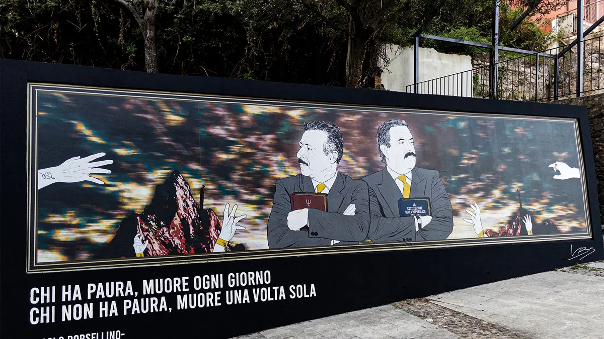 Rosso Costituente è un murale monumentale di 800 cm di lunghezza per 300 cm di altezza, un’imponente parete che raffigura Giovanni Falcone e Paolo Borsellino come guardiani della giustizia, schiena contro schiena, immobili e solenni. Falcone stringe al petto la Costituzione italiana, elevata a scudo civile e morale; Borsellino custodisce l’Agenda Rossa, emblema delle verità ancora taciute. Attorno a loro, una moltitudine di mani incatenate simboleggia chi è stato condannato per le stragi, mentre altre mani, libere, richiamano coloro che sono sfuggiti alla giustizia. Due mani più grandi dominano la composizione: a sinistra, una mano tatuata, segno degli esecutori materiali delle mafie; a destra, una mano con anello d’oro, simbolo dei mandanti esterni, i poteri occulti e trasversali rimasti spesso impuniti. Sullo sfondo, un cielo rosso e incendiato avvolge la scena, trasmettendo tensione e memoria, con un rosso che è insieme sangue, allarme e resistenza.