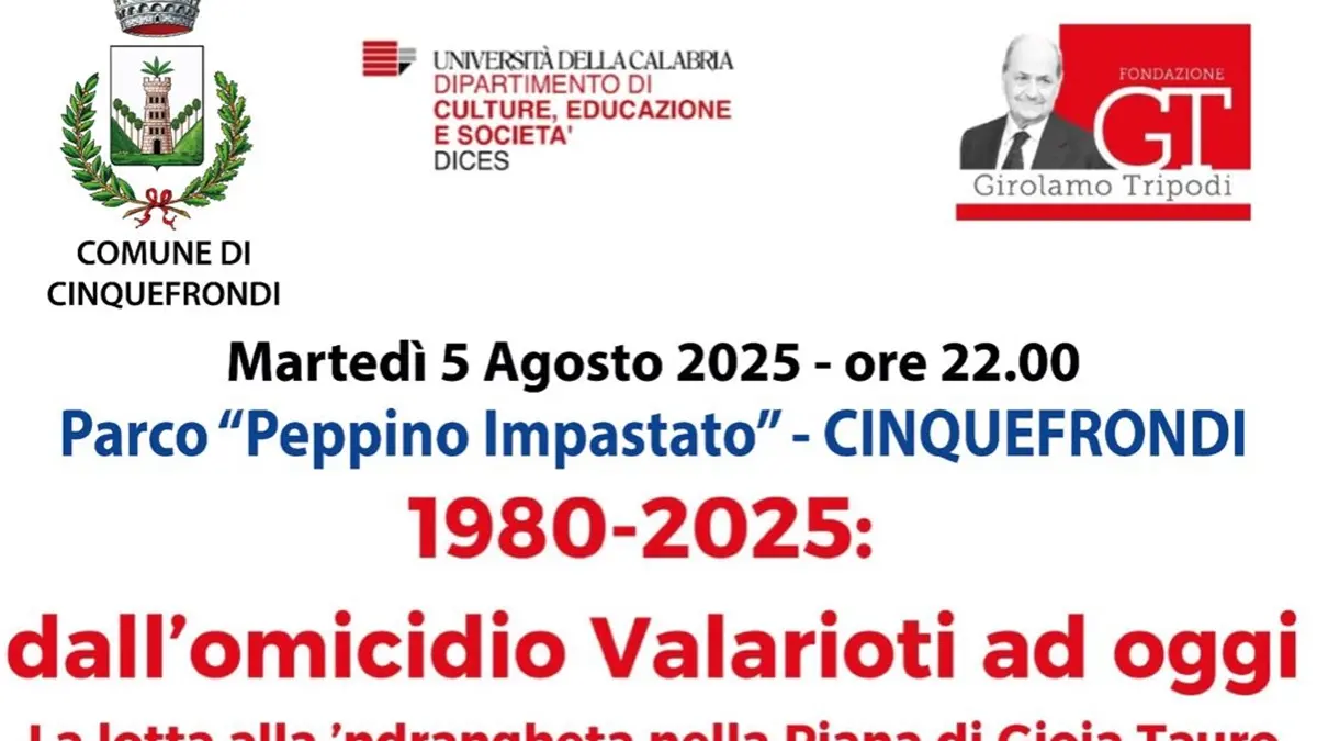 L’evento si aprirà con i saluti istituzionali del Sindaco di Cinquefrondi, Michele Conia, e di Michelangelo Tripodi, Presidente della Fondazione Girolamo Tripodi, e prevede l’intervento di Carmela Ferro, attivista antimafia e già compagna di Peppe Valarioti in quegli anni. Poi, toccherà a Giancarlo Costabile, docente di Pedagogia dell’Antimafia al DiCES UniCal, intervistare Stefano Musolino, Procuratore Aggiunto della Direzione Distrettuale Antimafia di Reggio Calabria, sui temi del convegno che si terrà alle ore 22.00 presso il Parco comunale Peppino Impastato.