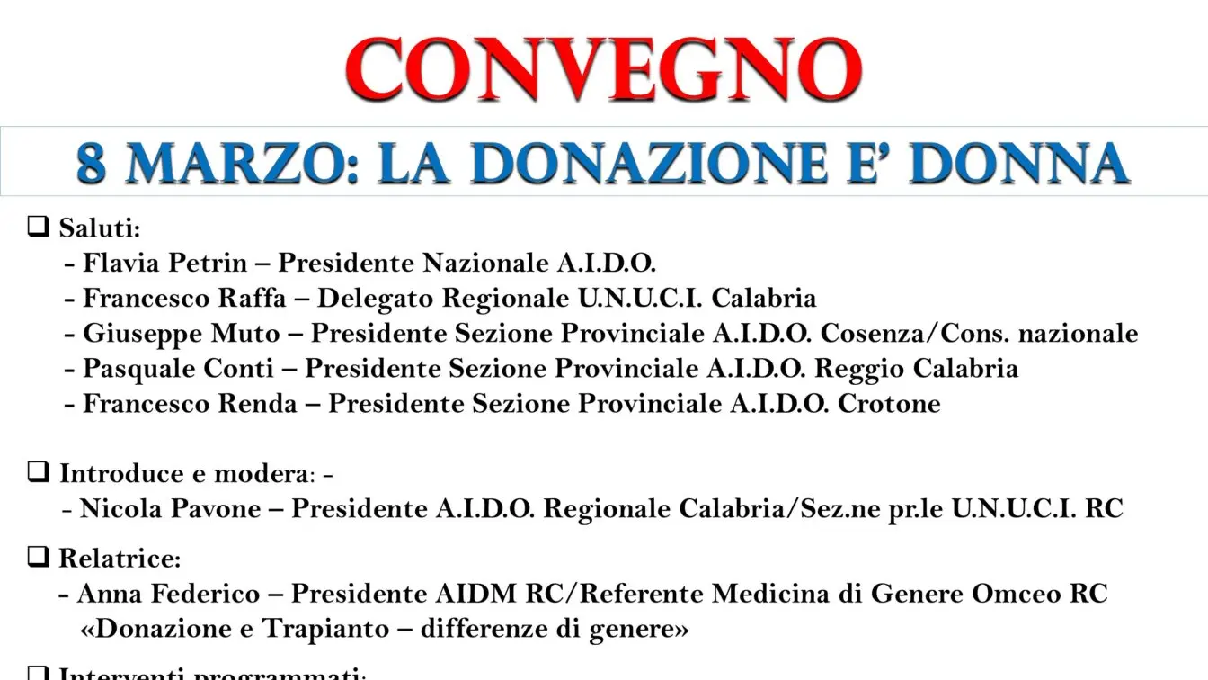 L’ A.i.d.o. Regionale Calabria – Associazione Italiana per la Donazione di Organi, Tessuti e Cellule e l ‘ U.N.U.C.I. Sezione provinciale Reggio Calabria – Unione Nazionale Ufficiali in Congedo d’ Italia, entrambe presiedute da Nicola Pavone, hanno organizzato on line con piattaforma Zoom per martedì 11 marzo 2025 alle ore 19:00 il Convegno “8 Marzo: La Donazione è Donna”. Dopo i saluti di Flavia Petrin (Presidente Nazionale Aido), Francesco Raffa (Delegato regionale Unuci Calabria), Giuseppe Muto, Pasquale Conti e Francesco Renda (rispettivamente presidenti provinciali Aido di Cosenza, Reggio Calabria e Crotone) i lavori saranno introdotti e moderati da Nicola Pavone, presidente di Aido Calabria e di Unuci sezione provinciale di Reggio Calabria.